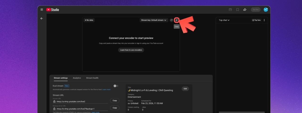 On Upstream, you don’t need to copy-paste the stream key. You can use YouTube Connect instead. Since Upstream is verified by YouTube and recommended as a software encoder, the connection is automated and secure. For a step-by-step guide, see this helpdesk guide.