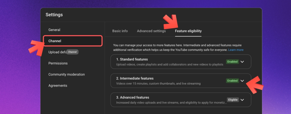 2. Go to the “Channel” tab and choose “Feature eligibility”,