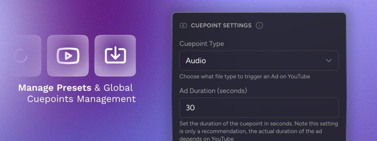 Setting up ad breaks in your streams is now more efficient with our new global cuepoints system. Instead of manually placing cuepoints between individual songs or videos, you can now configure them at a global level through the dedicated sidebar. This streamlined approach is particularly valuable for streams with extensive playlists, making ad break management more intuitive and less time consuming.