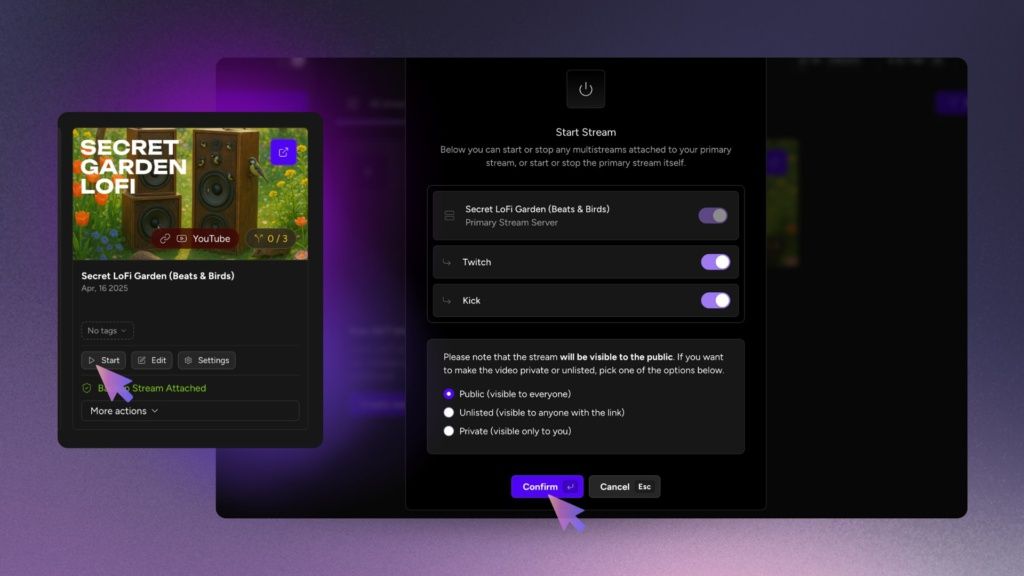 The market is too crowded to rely on one website. You need to expand your reach. Upstream gives you the tools to multistream to YouTube, Twitch & Kick without the technical headaches. We handle the distribution. You focus on the content.